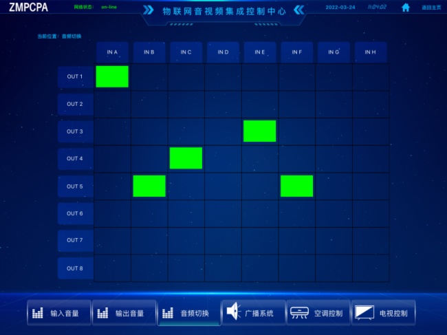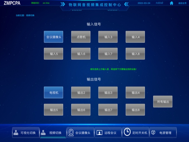 通过控制音视频矩阵,可以实现将所有的音视频输入信号切换到会议室的所有音视频输出设备上;