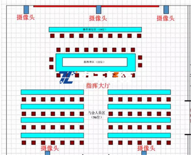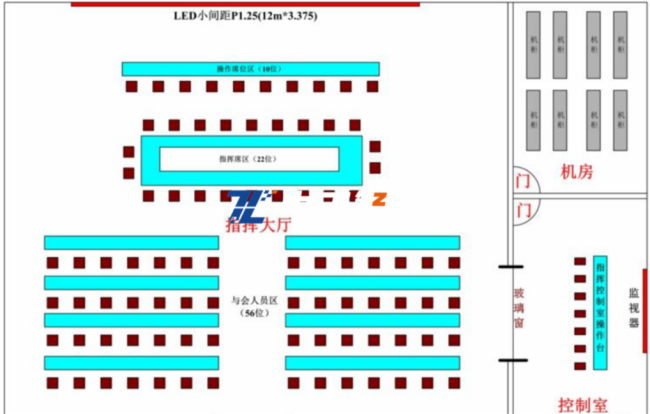 LED显示区、操作席位区、指挥席位区、与会人员区、机房、控制室;