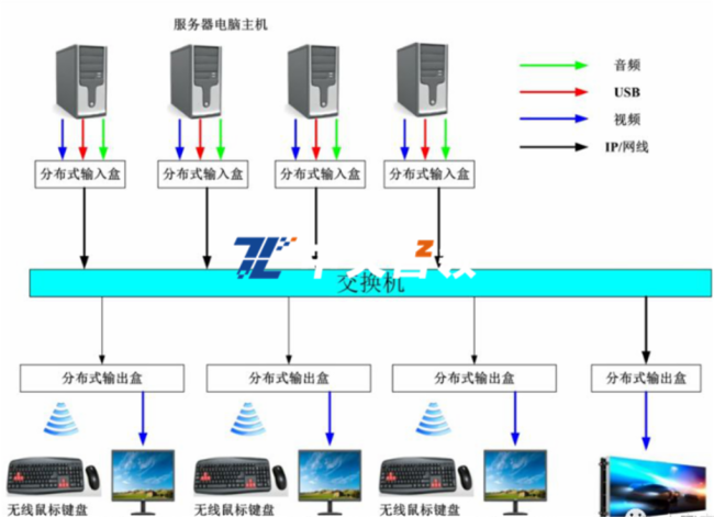 分布式可视化音视频KVM指挥调度综合平台系统组成是由显示大屏、分布式输入\输出节点、分布式服务器、分布式软件综合控制平台和千兆交换机组成的,整个系统连接是星星拓扑连接的。去中心化的系统结构,即使局部节点故障或分布式服务器当机都不影响整个系统的运行,只需要针对的更换故障设备即可。