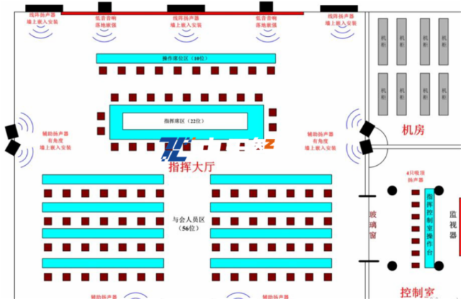 设计隐藏式音箱,采用数字化的音频处理器能够彻底解决本地会议扩声遇到的各种问题,保证声场均匀无反馈;声压级稳定,彻底把回声,背景噪音拒之门外,将完美会议进行到底。所有音响均采用嵌墙或吸顶的安装方式,保证指挥中心美观简洁(音响布局)