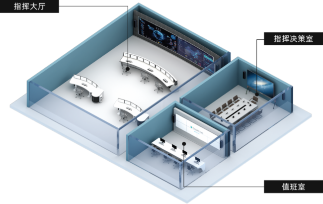 指挥中心类型迥异,根据用途可大致分为用于指挥调度的区域指挥大厅、用于辅助决策、会商会议用途的区域------指挥决策室以及用于整体监测、监控调度的区域------值班室等,下面根据以下三类区域对DANACOID指挥中心解决方案进行简单阐述:
