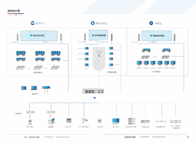 DANACOID从指挥中心音视频系统的需求出发,将各系统融合,组成完整的调度平台,系统包含交互式云屏系统、发言系统、扩声系统、零延时KVM系统、中控系统及大数据平台等,整个系统既可满足日常监控需求,又可满足突发状况应急指挥需求。