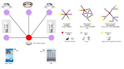 “Z是Zigbee,一种无线控制方式,尤其是结合移动终端的操作能让智能照明变得更简单;无线Zigbee技术智能平台是一个开放式体系,照明是一个核心需求,还可以加其他智能应用进来,连到云端,通过手机可以控制,也可以通过智能开关、智能触摸、面板实现现场控制。”付晓辉博士提到。