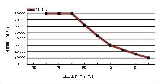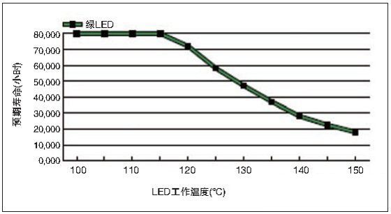 图3-5显示了LED的预期寿命与工作温度之间的关系。正如你所见的那样,一旦超出图2中为单色LED所限定的最高温度,预期寿命就会迅速跌到60,000小时以下。不过,如果与其它数据进行比较,我们就会发现,即使发生了风扇故障,eyevis公司的LED箱体内的导热管冷却系统能够将温度保持在必须的范围内,使LED的预期寿命能够达到60,000小时。