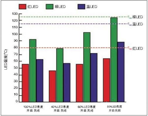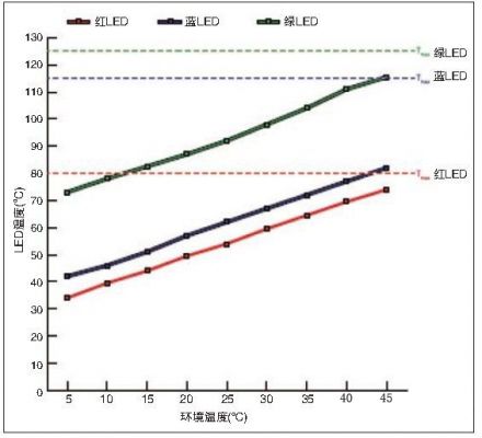 图2:100%亮度下,不同环境温度下在导热管冷却系统中的LED的温度