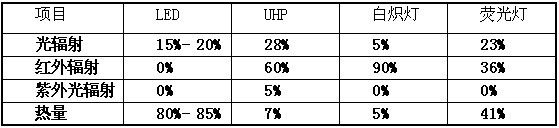 LED光源由于光谱特性,导致在同等亮度的情况下,光源部分产生的热量要高于UHP(见图二)。所以其对于整个投影显示单元的散热设计要求以及环境温度的控制要求也就更高。目前主流的散热方式主要是风冷式和水冷式两种。应该说各有优缺点。风冷式比较传统、成熟,水冷式散热效率略高于风冷式,但是设计难度较高,长期使用的可靠性有待检验。