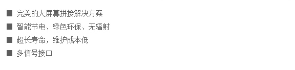 u 7×24小时不间断工作;超长使用寿命,零维护成本;支持1080P高清信号源1:1精确取样,图像不压缩、不失真完美再现;最先进的动态液体循环冷却系统;七色域调整技术;多重防尘结构;符合RoHS专业环保测试标准。